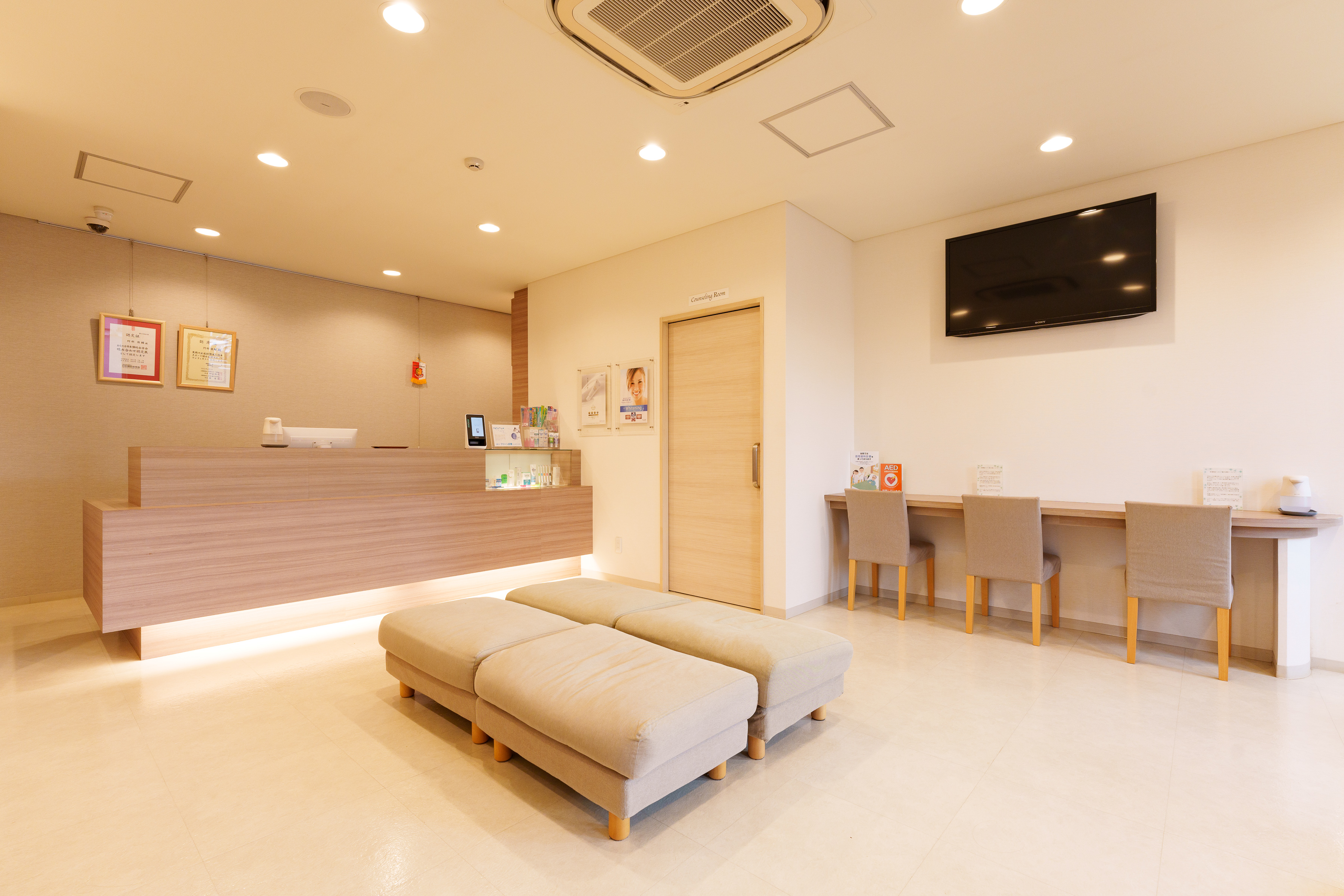 当医院には、医療安全対策に関する研修を受けた歯科医師及び医療安全管理者を配置、自動体外式除細動器(AED)を保有し、緊急時においては他の医療機関と連携するとともに、医療安全に係る十分な体制を整備しています。